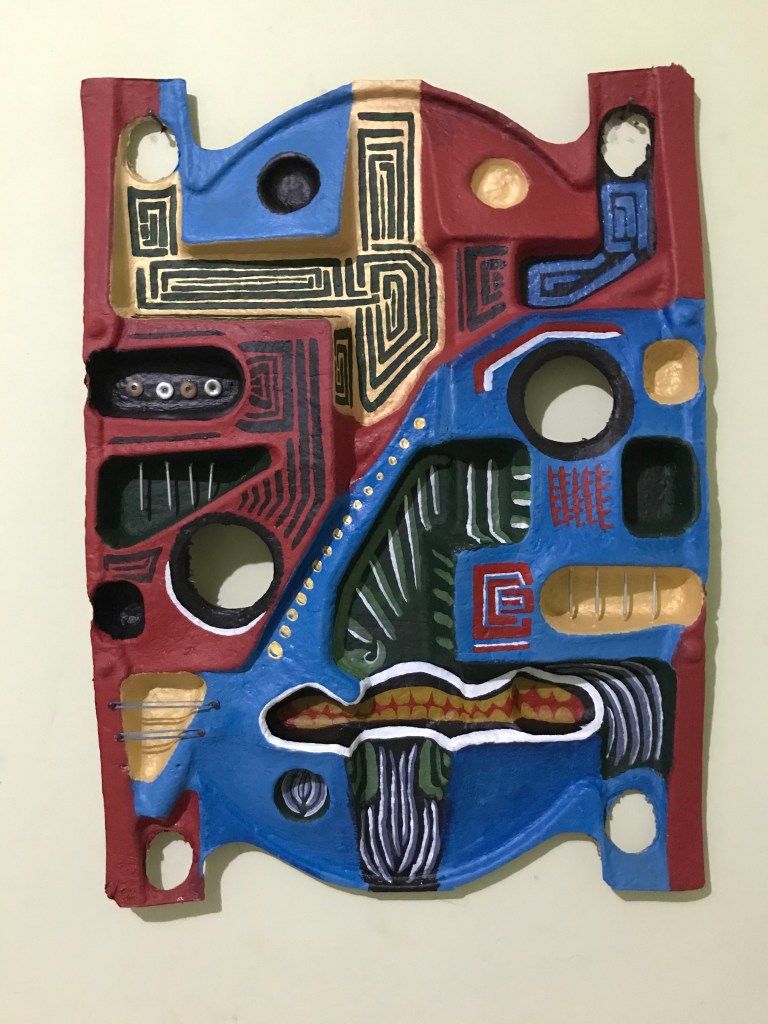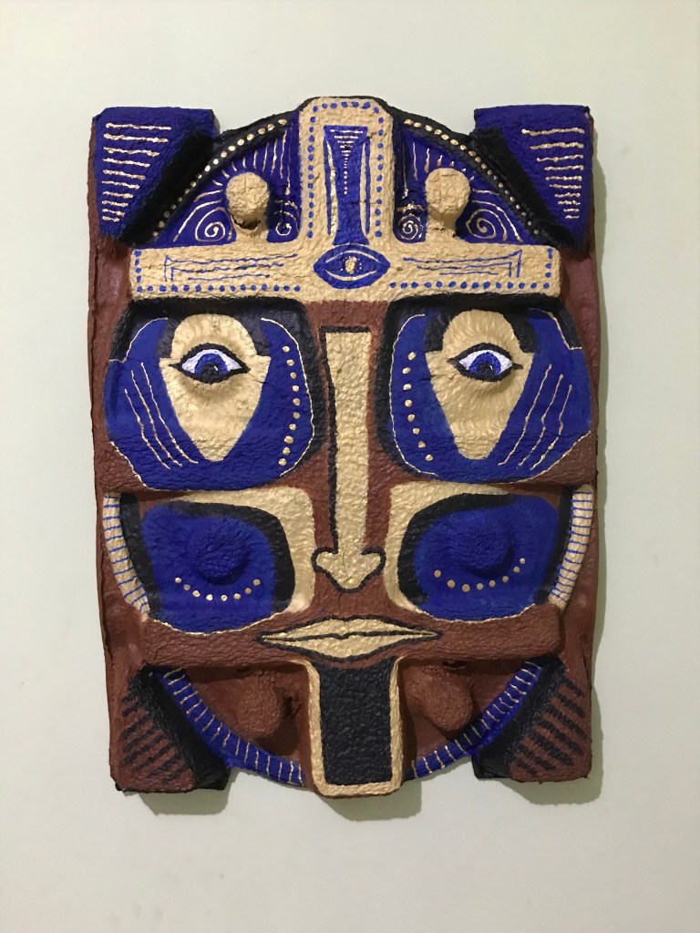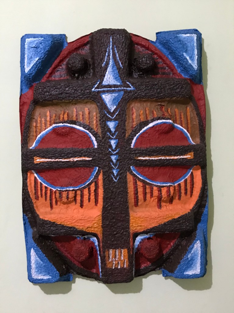The mask forms in this series are carton insets from home internet dish packaging. The satellite, and thus the internet, has become a means of modern communication, connecting humans across the globe. The traditional African mask is used as a form of communication with our ancestors, the environmental elements around us, and the universal energy that connects all living beings. Both satellites and traditional masks use invisible waves to communicate across space and time.